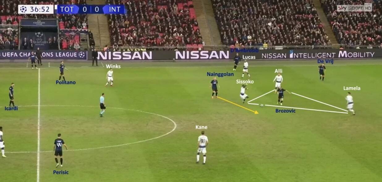 Giocando con 5 giocatori offensivi, il Tottenham ha potuto portare un grado di pressione intorno a Brozovic che l’Inter non è abituata a fronteggiare. Con una linea di difesa più organizzata, la Roma può fare lo stesso sfruttando i 4 attaccanti e Cristante.