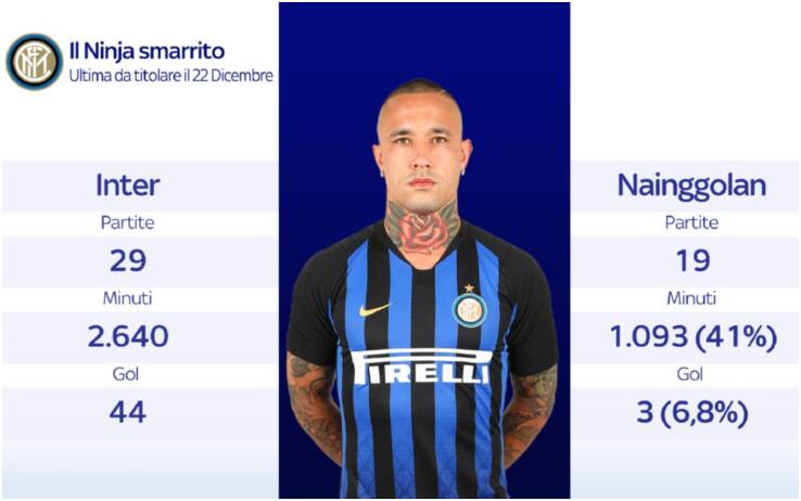 Il rigore sbagliato contro la Lazio è l'emblema della sua stagione. Nainggolan non scende in campo da titolare dallo scorso 22 dicembre e ha accumulato meno della metà dell'intero minutaggio nerazzurro. In termini realizzativi appena 3 gol sui 44 totali