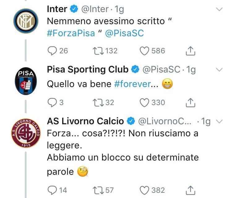 Nel calcio moderno le squadre si incontrano in campo sì, ma anche sui social. Nel 2019 accade pure che tre società scherzino tra di loro su Twitter, mettendo da parte vecchie sfide e storiche rivalità. E può capitare, dunque, che un semplice 'On this day' dell'Inter scateni un simpaticissimo siparietto che coinvolge anche Pisa e Livorno, società rivali da sempre. I nerazzurri hanno pubblicato un video di una partita del 2010, vinta contro la squadra amaranto per 3-0 con la doppietta di Eto'o e il gol di Maicon. Ricordi dolci per i tifosi dell'Inter, considerando che si trattava dell'anno del 'Triplete'. Ma anche i tifosi del Livorno rimpiangono quegli anni della Serie A. La società amaranto, in risposta a questo tweet, ha pubblicato una scherzosa GIF con la scritta 'Gne gne gne'. Uno sfottò proseguito dall'Inter, che ha risposto: "Nemmeno avessimo scritto Forza Pisa". E lì è subentrata anche l'altra squadra toscana: "Quello va bene forever...". A chiudere il siparietto ci ha pensato il Livorno, in risposta al Pisa: "Forza... cosa?!?!?! Non riusciamo a leggere. Abbiamo un blocco su determinate parole". Il tutto condito con emoticon e... tanta ironia!