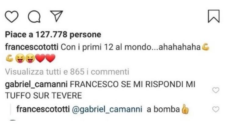 Gabriel Camanni, tifoso della Roma, promette su Instagram di lanciarsi nel Tevere in cambio di un saluto di Totti. Il dirigente giallorosso lo accontenta, suggerendo anche la modalità di tuffo: "A bomba". Il fan del capitano mantiene la parola data e pubblica il video sui social