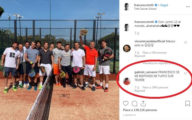 Tutto è iniziato con una foto pubblicata da Francesco Totti il 19 aprile sul proprio account Instagram. Nell’immagine l’ex attaccante posa insieme ad altri amici durante un torneo di padel: "Con i primi 12 al mondo", scrive simpaticamente il dirigente della Roma. Tra i tanti follower intenti a commentare la foto, c’è anche un certo Gabriel Camanni, tifoso giallorosso che decide di tentare il tutto per tutto per attirare l’attenzione del proprio capitano: "Francesco, se mi rispondi mi tuffo nel Tevere". La promessa di Gabriel riceve in poco tempo quasi 3mila like e centinaia di commenti su Instagram, con molti utenti che chiedono a Totti di accontentare il suo fan. Dopo qualche ora, arriva la tanto attesa risposta: "A bomba", scrive la leggenda della Roma, suggerendo a Gabriel anche il tipo di tuffo. A quel punto l’attenzione si sposta sull’account Instagram del giovane romanista, per vedere se avrà mantenuto o meno la promessa. "Questo video è per Francesco Totti", esclama Gabriel con voce emozionata qualche istante prima di lanciarsi nel Tevere. Vestito solo con scarpe e costume rosso, il fan del capitano si tuffa "a bomba" nel fiume, ripreso dagli smartphone degli amici. "Le promesse al Re vanno mantenute!", scrive Gabriel.