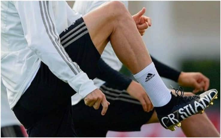 L'ultima trovata del brand CR7 (che veste dalla testa ai piedi, senza trascurare l'intimo) è uno scarpino personalizzato in cui il nome del fenomeno portoghese si fonde con il suo numero, in una stampa a caratteri cubitali sull'esterno del piede. Colori? Bianco e nero, ovviamente, con inserti dorati