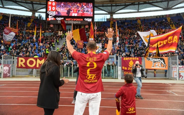 Nel pre partita di Roma-Juve, invitato dalla società giallorossa insieme all'altro ex, l'austriaco Michael Konsel, il "Pendolino" ha ricevuto gli applausi dei suoi ex tifosi. Una sfilata sotto la curva: palleggi, maglia (ovviamente la numero 2) indossata e classico gesto con pollice e indice alzati a salutare tutto l'Olimpico. Tra i tanti incontri di Cafu, anche quello con Pavel Nedved, al tempo rivale di derby con la maglia della Lazio e dunque della Juve. Una "reunion" che ad alcuni ha riportato alla mente quella super giocata di tanti anni fa. Evidentemente mai dimenticata.