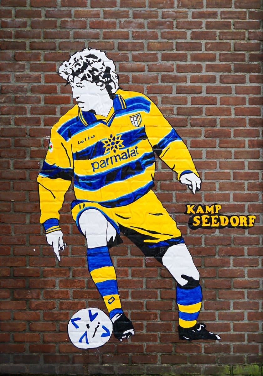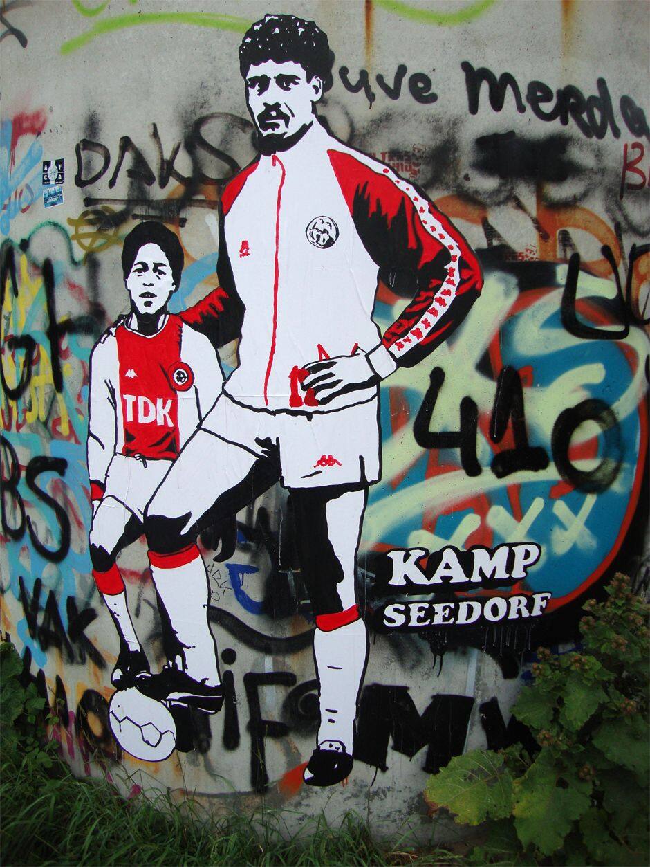 La firma di Kamp Seedorf è ormai divenuta negli anni conosciutissima soprattutto nel panorama underground dell’arte visiva. Il collettivo di Almere, città olandese, formato da un numero imprecisato di componenti (si parla di dieci persone, ndr) che si celano volutamente dietro a pseudonimi, non è nuovo a opere di questo tipo ed è specializzato nella raffigurazione di campioni del pallone, rapper e altri personaggi eccentrici. Le loro opere sono semi-permanenti: i poster di carta, dipinti a mano, sono infatti solo incollati e dunque più facili da rimuovere rispetto ai graffiti. Famosi i murales che hanno immortalato icone del calcio, come Maradona, Bergkamp, Kluivert, Eusebio, Crespo e lo stesso Seedorf, ex giocatore del Milan e icona del gruppo.