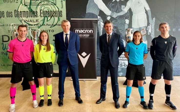Gli arbitri Uefa cambiano pelle. O meglio, maglia. E a cominciare dalle finali di Madrid e Baku vestiranno, per l'appunto italiano. Il tutto grazie all'accordo ufficializzato questa mattina, 23 maggio, presso la sede della UEFA a Nyon, dove Roberto Rosetti, responsabile del settore arbitrale UEFA, e Gianluca Pavanello, CEO di Macron, hanno celebrato la partnership svelando le nuove divise. I nuovi kit Macron per gli arbitri UEFA faranno il loro esordio nei due più importanti e attesi appuntamenti della stagione delle competizioni europee per club: la finale di UEFA Europa League a Baku tra Chelsea e Arsenal e la finale di UEFA Champions League a Madrid tra Liverpool e Tottenham. Le nuove maglie mantengono i tradizionali colori nero, giallo fluo, azzurro fluo e rosa fluo. Dotate di comode tasche anteriori con chiusura in velcro, sono connotate nella parte anteriore da un disegno rigato e dettagli neri (tranne che nella versione black) nel girocollo e sui bordo manica. Sul petto al centro il Macron Hero, nuovo e identificativo logo del brand italiano. Shorts neri per tutte e quattro le maglie e calzettoni che riprendono il colore della singola maglia, con una banda orizzontale nera con il Macron Hero. La vestibilità è Slim Fit e gli inserti in micromesh consentono la massima traspirabilità.