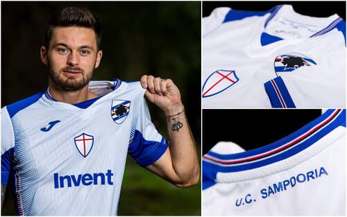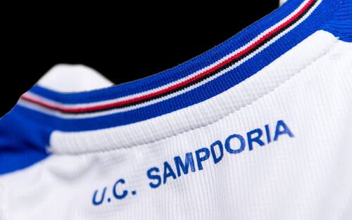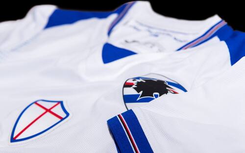 Il blucerchiato è stato inserito come se fosse un’onda di colori, e collocato nella parte esterna e finale della maglia. Il logo ufficiale del club e lo scudo di Genova sono stati inseriti nella posizione classica: scudetto sul cuore e scudo di Genova al centro del petto