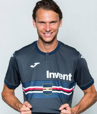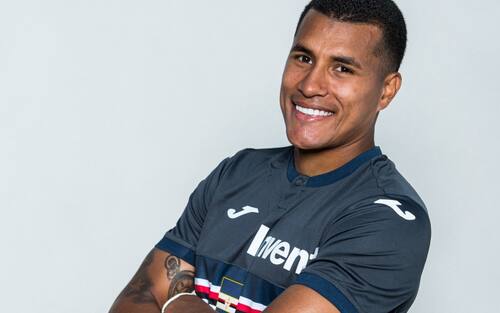 Gianluca Caprari fa da modello: al centro della maglia c'è la banda blucerchiata