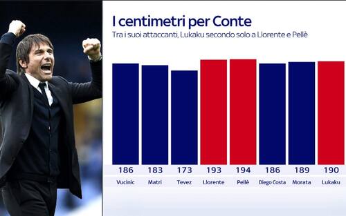 Lukaku, Pellé e gli altri attaccanti di Antonio Conte: l’allenatore nerazzurro ama utilizzare nel suo 3-5-2 centravanti forti fisicamente. E il belga, appena arrivato all’Inter dal Manchester United, è alto 190 centimetri. La classifica per stazza delle altre punte allenate in carriera da Conte