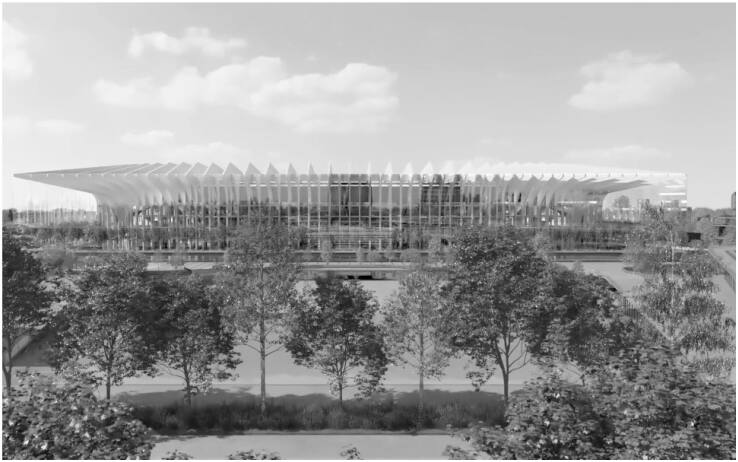 Vista esterna del nuovo stadio di uno dei due progetti finalisti (dal canale youtube "mufate7")