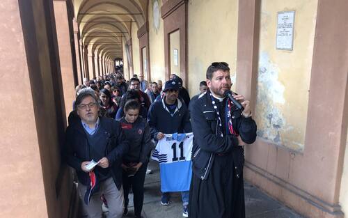 Un pellegrinaggio guidato da don Massimo Vacchetti, che presiede l'Ufficio per la Pastorale dello Sport della Diocesi di Bologna e che ha dato vita a un momento di preghiera condiviso fra le due tifoserie al santuario di San Luca