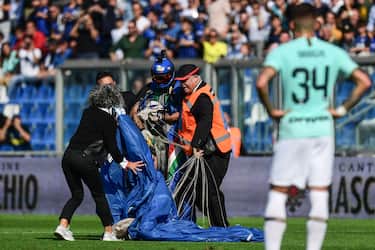 L'attenzione del Mapei Stadium era rivolta verso un calcio di rigore appena assegnato ai nerazzurri di Conte, che ha poi permesso di chiudere il primo tempo sull'1-3. L'anonimo invasore, piombato dal cielo in paracadute al 43' di Sassuolo-Inter, è stato accompagnato rapidamente fuori