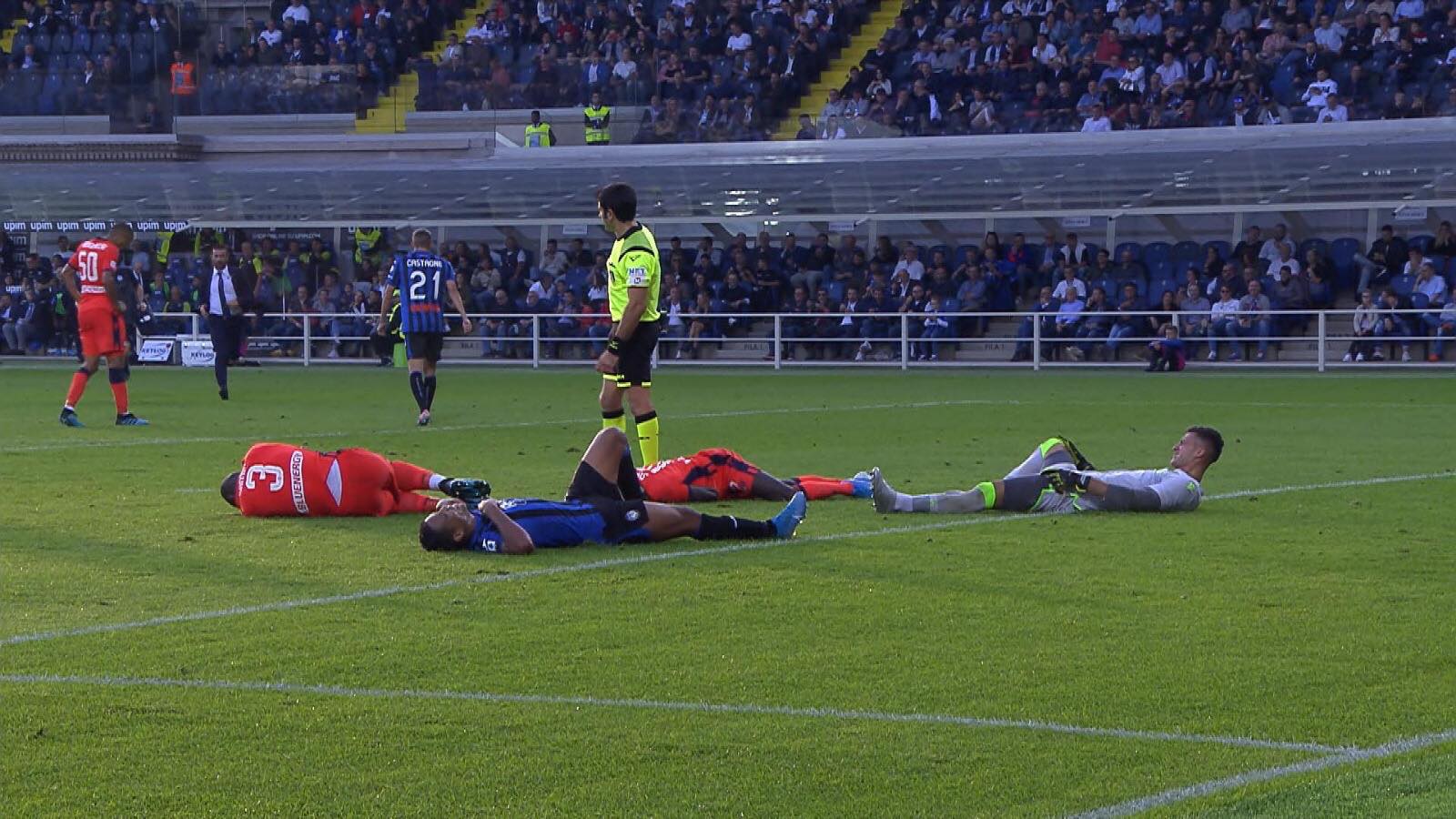 Fra le tante cose successe nel 7-1 fra Atalanta e Udinese anche... uno strike! Nell'occasione che ha portato al secondo rigore, quello del 6-1, Muriel è stato travolto da Samir davanti a Musso. Il difensore dell'Udinese ha finito poi, sullo slancio, per mettere a terra anche il compagno di squadra Sema che cadendo è finito addosso al proprio portiere in uscita. Il risultato della carambola è nel video e nella foto qui sotto...