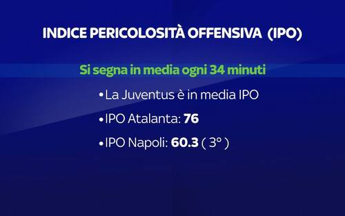 Come conferma quest'altra immagine, l'Atalanta ha un IPO di 76 punti di media a partita. Considerando la media generale della Serie A di un gol segnato ogni 34 punti, la squadra di Gasperini crea occasioni per segnare almeno due reti a match. Il Napoli è terzo in assoluto mentre la Juventus, stando ai gol segnati (fin qui 23), è in perfetta media IPO.