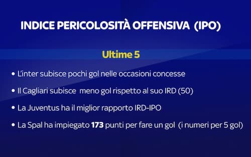Questo invece uno sguardo più dettagliato alle ultime cinque partite. L'IRD del Cagliari è 50, il che significa che nella realtà ha subito meno reti (13) dei rischi corsi. Mentre la Spal (un solo gol nelle ultime cinque giornate) ha collezionato ben 173 punti segnando, per l'appunto, soltanto una volta. La sintesi di questi nuovi indici per valutare le prestazioni è che, tendenzialmente e nel proseguo di tutto il campionato, chi crea di più avrà più possibilità di volare alto in classifica.