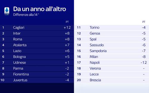Ecco nel dettaglio la classifica della Serie A con le differenze alla 14^ giornata tra il 2018 e il 2019: impressionante il saldo positivo del Cagliari (+12) che precede la coppia Inter- Roma (+8). Bene anche Atalanta (+7) e Lazio (+6) oltre al Bologna (+5). Chi ha perso punti è invece la Juventus (-4 nel confronto), ma ad occupare le ultime posizioni sono il Milan (-8) e soprattutto il Napoli (-12)