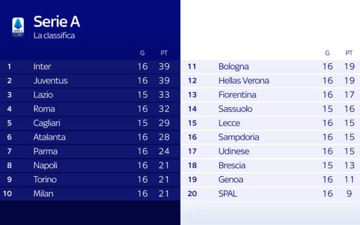 Molti (tifosi e non solo) si sono chiesti il perchè. Inter ‘ufficialmente’ prima nonostante lo scontro diretto di San Siro ha visto trionfare gli uomini di Sarri. Il perché è presto spiegato. Tutte le classifiche sono gestite da algoritmi con una serie predefinita di discriminanti. Nel girone d’andata, la prima di queste discriminanti non è lo scontro diretto bensì la differenza reti (attualmente favorevole all’Inter: +18 contro +13 della Juve). La motivazione è abbastanza intuitiva: fino a quando tutte le squadre non si sono incontrate almeno una volta, non può esserci un criterio valido per tutte. Non si può dire a un programma: “se si sono scontrate usa questo, altrimenti usa quell’altro” perché in caso di tre o più squadre a pari punti senza che tutte si siano sfidate, ci sarebbero errori di compilazione. Ecco quindi perché l’Inter è attualmente prima e la Juventus seconda. Allo scattare del girone di ritorno cambierà la prima discriminante che sarà, come noto, lo scontro diretto. Ulteriore curiosità: nei gironi di Champions League, limitatamente alle gare di andata, in caso di due o più squadre a pari punti, il primo criterio non è la differenza reti ma… l’ordine alfabetico!
