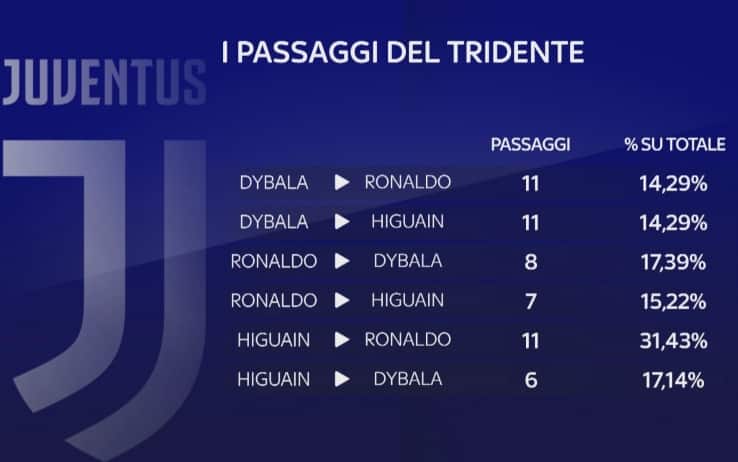 I numeri intanto spingono tutti in un'unica direzione. Higuain, Ronaldo e Dybala hanno giocato insieme in cinque occasioni (in cui la Juve peraltro non ha mai perso), totalizzando 167 minuti in cui sono stati effettuati 32 tiri. Sei reti totali, di cui cinque a firma degli attaccanti del tridente. Il giocatore più ricercato è proprio CR7, che ha ricevuto 11 passaggi sia da Higuain che da Dybala.