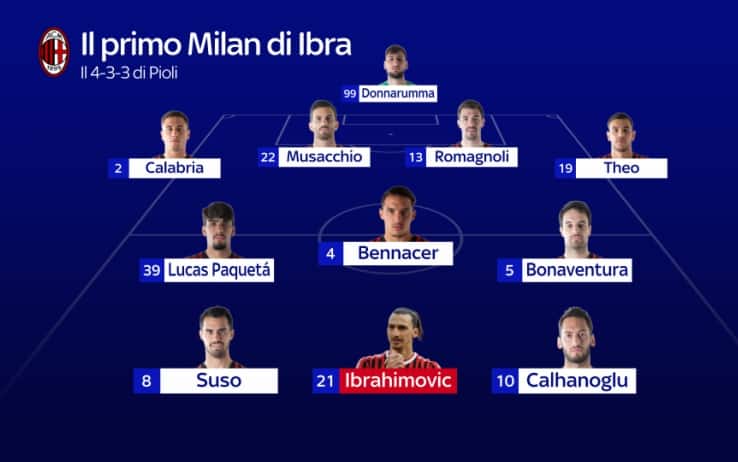 Milan nel 1° tempo (4-3-3): Donnarumma; Calabria, Musacchio, Romagnoli, Hernández; Paquetá, Bennacer, Bonaventura; Suso, Ibrahimovic, Calhanoglu