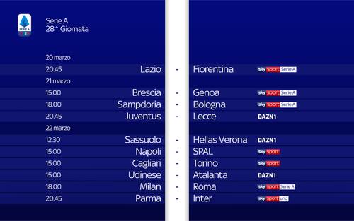 La Lega di Serie A ha ufficializzato il nuovo programma delle gare della 27^ giornata (13-15 marzo) e della 28^ (20-22 marzo). Ecco cosa cambia