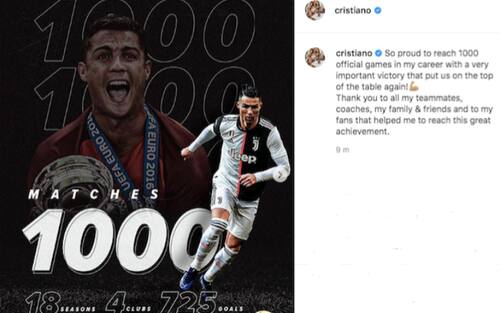 Serata da ricordare per Cristiano Ronaldo: il portoghese non ha segnato, ma la sua Juve è uscita con tre punti fondamentali dallo scontro diretto con l'Inter. "Sono orgoglioso di raggiungere 1000 partite ufficiali nella mia carriera con una vittoria molto importante che ci porta di nuovo in testa alla classifica! Grazie ai miei compagni, agli allenatori, alla mia famiglia, agli amici e ai tifosi che mi hanno aiutato a raggiungere questo grande traguardo", ha scritto su Instagram CR7. Di seguito presenze e gol divisi squadra per squadra