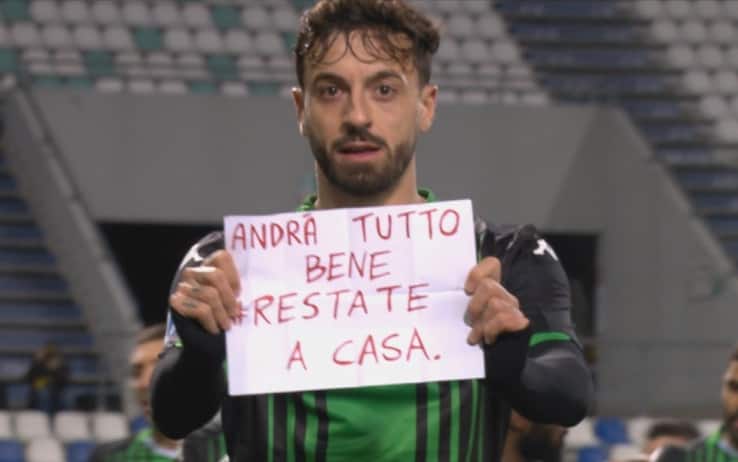 L'attaccante del Sassuolo sblocca la gara contro il Brescia e poi esulta mostrando in camera un cartello consegnatogli dai compagni in panchina: "Andrà tutto bene", accompagnato dall'hashtag-appello "Restate a casa"