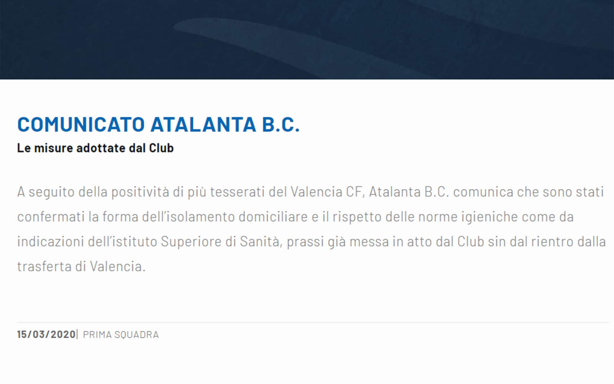 Nuova misura imposta dall'Atalanta ai propri giocatori, provvedimento adottato in seguito alla positività al Coronavirus di cinque giocatori del Valencia. Oltre ad Ezequiel Garay, giocatore che non aveva affrontato i nerazzurri nella doppia sfida di Champions League, gli spagnoli hanno comunicato altri quattro casi nella propria rosa tra giocatori e componenti dello staff medico. Affrontata mercoledì al Mestalla, match di ritorno che ha sancito l’accesso ai quarti di finale della squadra di Gasperini, l’Atalanta ha comunicato attraverso una nota ufficiale la propria decisione: "A seguito della positività di più tesserati del Valencia CF, Atalanta B.C. comunica che sono stati confermati la forma dell’isolamento domiciliare e il rispetto delle norme igieniche come da indicazioni dell’istituto Superiore di Sanità, prassi già messa in atto dal Club sin dal rientro dalla trasferta di Valencia”.