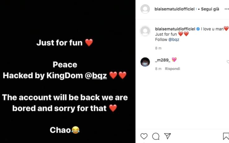 Per qualche ora Blaise Matuidi non è stato padrone del suo account Instagram, violato da un hacker. Non c’era più la sua foto, sostituita dall’icona bianca tipica di chi si è appena iscritto al noto social network. Il nome, "blaisematuidiofficiel" era lo stesso, ma sotto era comparsa una scritta inequivocabile: hacked, cioè "profilo hackerato". L’intruso si era voluto presentare con un messaggio pubblicato nel pomeriggio: "Solo per divertimento", spiegando che "siamo annoiati e dispiaciuti per questo" e che "l’account tornerà".