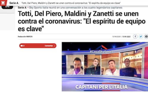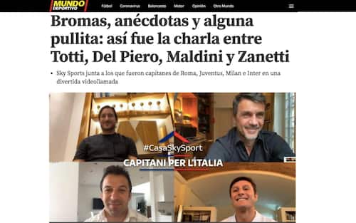 MARCA - Gli spagnoli della celebre testata di Madrid aprono così il proprio articolo: "Sky Sports Italia logró reunir a cuatro legendarios capitanes del fútbol italiano en una histórica conversación". Sky Sport è riuscita a riunire quattro leggendari capitani in una storica conversazione. Lo spirito del gruppo è la chiave - titolano sulle proprie pagine online.