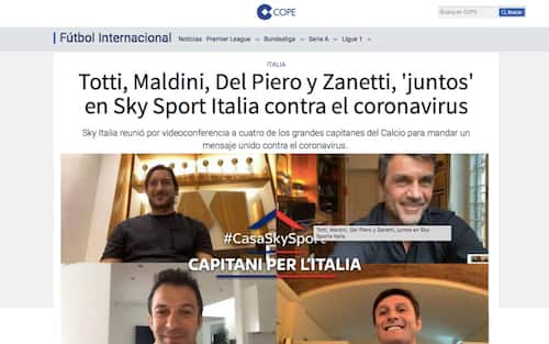 COPE - In Spagna anche Cope riprende la conversazione di Casa Sky Sport: "Totti, Maldini, Del Piero e Zanetti: 'insieme' su Sky Sport contro il coronavirus"