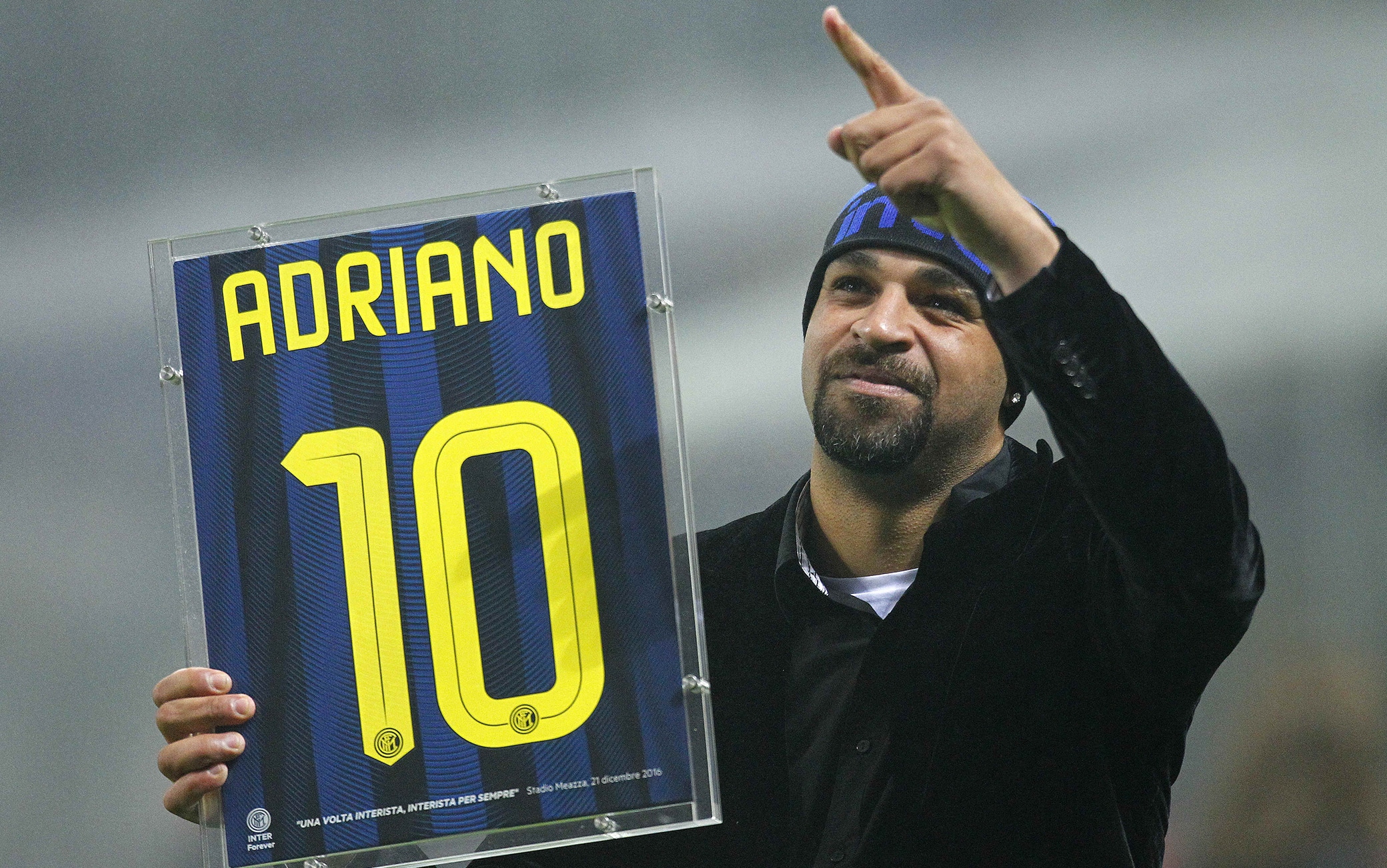 "Imperatore. All’inizio non pensavo ce l’avessero con me, quando mi chiamavano così. È stato divertente e bello scoprire pian piano l’affetto di tutto il popolo interista nei miei confronti. Mi sono sempre sentito a casa, a Milano: il mio amore per i tifosi dell’Inter è infinito. Sono diventato subito un interista vero: il mio 3-2 nel derby all’ultimo minuto ne è una testimonianza, vero? Il gol all’Udinese scartando mezza squadra, le vittorie più belle, le sconfitte, i trionfi, quel missile alla Roma nella finale di Coppa Italia. Sapete contro chi ho segnato il mio ultimo gol con la maglia dell’Inter? Nel derby con il Milan, ovviamente! L’Inter è un pezzo di me davvero grande, che si è intrecciato con la mia vita, colorando i momenti più belli e accompagnandomi in quelli più tristi e difficili. Ma ancora oggi, quando penso a Milano, a San Siro, alla maglia nerazzurra, mi viene da cantare quella canzone che non mi toglierò mai dalla testa e che, ogni volta, mi faceva sentire felice, a casa, uno di voi, uno di noi: 'Che confusione, sarà perché tifiamo, un giocatore che tira bombe a mano, siam tutti in piedi per questo brasiliano, batti le mani, che in campo c'è ADRIANO!'. Forza Inter! Adriano".