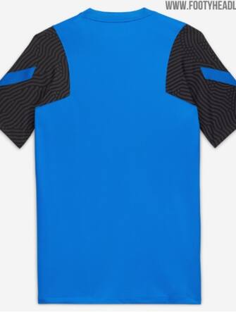 La maglia di allenamento dell'Inter per la prossima stagione presenta un modello a girocollo, con una base azzurra, maniche nere e loghi gialli