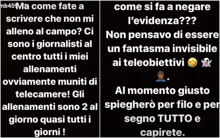 La risposta di Mario Balotelli non si è fatta attendere. Il calciatore ha affidato il proprio punto di vista sulla vicenda a una stories su Instagram: "Ma come fate a scrivere che non mi alleno al campo? Ci sono giornalisti al centro sportivo in occasione di tutti i miei allenamenti, ovviamente muniti di telecamere! Gli allenamenti sono due al giorno, quasi tutti i giorni. Come si fa a negare l'evidenza? Non pensavo di essere un fantasma invisibile ai teleobiettivi. Al momento giusto spiegherò tutto per filo e per segno e capirete". L'attaccante del Brescia, dunque, smentisce la sua assenza all'allenamento di questa mattina, nonostante il club stesso abbia confermato di non averlo visto al campo per l'appuntamento stabilito. Un vero e proprio mistero (decisamente buffo) la cui soluzione sempre più probabile sembra quella della separazione, considerato anche il contratto in scadenza il 30 giugno e le dichiarazioni di Cellino di qualche giorno fa che di fatto prendeva le distanze dal giocatore che aveva tanto voluto nel suo Brescia. Strade divise, che chiudono definitivamente questo stranissimo ballo del Balo.