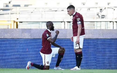 Dopo l'abbraccio dei compagni, il difensore del Torino si inginocchia: è un gesto che ricorda da vicino il gesto di protesta del movimento "Black Lives Matter" dopo l'uccisione negli Stadi Uniti di George Floyd
