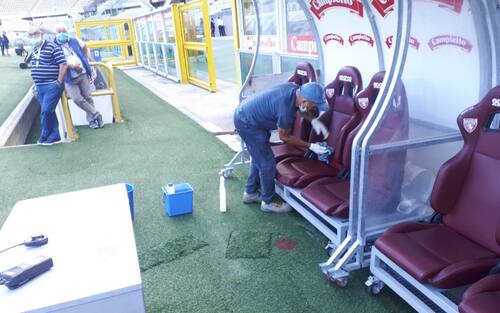 Operai all'opera prima della partita per la sanificazione anche della panchina