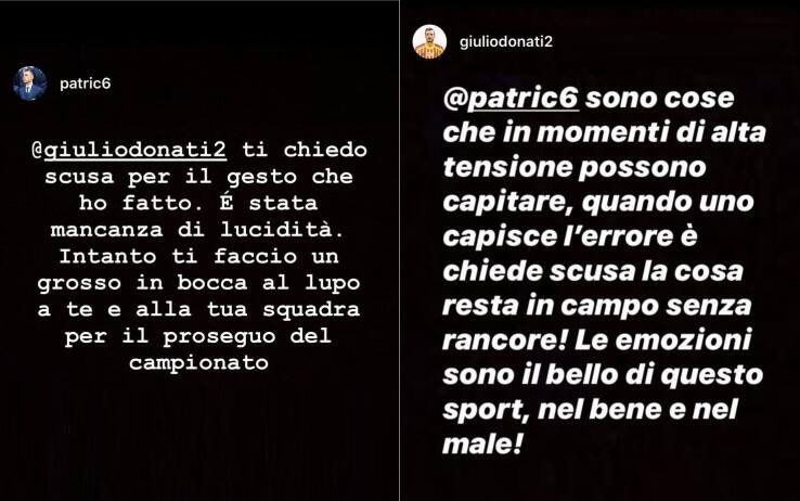 Nonostante il nervosismo del campo e il brutto gesto del difensore della Lazio, al Via del Mare c'è subito stata la pace poi sancita definitivamente sui social. Lo stesso Donati, nel post-partita, aveva dichiarato di aver perdonato Patric dopo aver ricevuto le scuse già negli spogliatoi. Il difensore della Lazio, successivamente, ha anche pubblicato una storia su Instagram: "Donati, ti chiedo scusa per il gesto che ho fatto. È stata mancanza di lucidità. Intanto ti faccio un grosso in bocca al lupo a te e alla tua squadra per il prosieguo del campionato", le parole di Patric. Prontamente è arrivata la risposta del giocatore del Lecce: "Sono cose che in momenti di alta tensione possono capitare, quando uno capisce l'errore e chiede scusa la cosa resta in campo senza rancore. Le emozioni sono il bello di questo sport, nel bene e nel male".