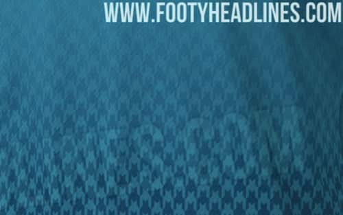 Qui l'immagine completa della divisa anticipata da "Footy Headlines". Si notano anche il girocollo di un blu più scuro, così come per il bordo delle maniche. Texture particolare scendendo verso la vita.