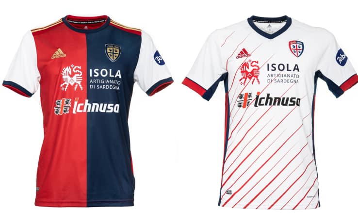 Le divise sono un omaggio alla storia del club. La prima riprende i colori iconici del Cagliari: rosso e blu al centro, bianco sui lati. Tutte le tinte dei primi cento anni di questa società racchiuse in un'unica maglia, con elementi innovativi per guardare al futuro. Al centro delle bande verticali rosse e blu, le maniche bianche e il retro interamente rosso con i numeri bianchi bordati di blu. Sul petto è visibile il logo dorato, un altro dettaglio da segnalare è la scritta in corsivo 'Cagliari Calcio' presente sul colletto in girocollo. La versione 'Away', invece, è bianca, arricchita da una fantasia rossa e da una banda interna laterale blu con tre strisce rosse. Il collo è a V e sul giromanica ci sono i colori rosso e blu della società.