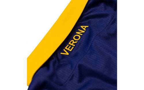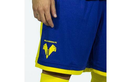 Sul petto a destra il Macron Hero, in stampa siliconata, a sinistra, lato cuore il nuovo logo dell’Hellas Verona. Shorts blu con coulisse gialle e calzettoni blu con bordo superiore giallo completano il kit casalingo