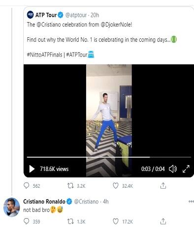 Serie AIl tennista serbo ne imita l'esultanza con tanto di "siuu" su Twitter, l'attaccante della Juventus commenta con una risposta laconica: "Non male". Non è la prima volta che i due si scambiano opinioni sul calcio: nello scorso dicembre il numero 1 del ranking Atp era andato a lezione di salto da CR7