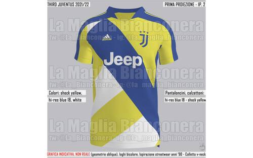 TERZA MAGLIA - Addirittura rivoluzionaria quella che potrebbe essere la terza maglia della Juve 2020/21. Una doppia proiezione con un logo Adidas bicolore sul petto a celebrare gli anni ’90: il design è infatti ispirato alla linea Adidas Equipment degli anni '90. Anche in questo caso, come per la maglia da trasferta, le due previsioni arrivano dall’account specializzato 'La Maglia Bianconera': un design d’eccezione per la terza divisa che combina una base gialla al blu e al bianco