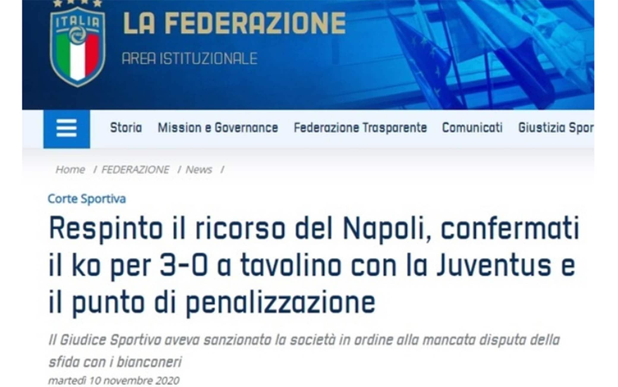Fissata per il 9 novembre, la sentenza della Corte d’Appello Federale (ovvero il secondo grado di giudizio) è preceduta dal collegamento in remoto di Aurelio De Laurentiis per spiegare la posizione del Napoli. Da registrare come la Juventus non aveva intenzione di opporsi alla decisione, qualunque essa fosse stata. Sentenza rinviata ma ufficiale il giorno seguente: respinto il ricorso del Napoli e confermato il 3-0 a tavolino per la Juve (con un punto di penalizzazione a carico degli azzurri). La motivazione: "Contrariamente a quanto sostenuto in ricorso, la Società ricorrente non si è trovata affatto nella impossibilità oggettiva di disputare il predetto incontro, avendo, invece, indirizzato, in modo volontario e preordinato, la propria condotta nei giorni antecedenti all’incontro nel senso di non disputare lo stesso, con palese violazione dei fondamentali principi sui quali si basa l’ordinamento sportivo, ovvero la lealtà, la correttezza e la probità". E ancora: "Il fine ultimo dell’ordinamento sportivo è quello di valorizzare il merito sportivo, la lealtà, la probità e il sano agonismo. Tale principio non risulta essere stato rispettato, nel caso di specie, dalla Società ricorrente (Napoli, ndr), il cui comportamento nei giorni antecedenti Juventus-Napoli, risulta teso a precostituirsi, per così dire, un 'alibi' per non giocare quella partita. La mancata disputa non è dipesa da una causa di forza maggiore bensì da una scelta volontaria, se non addirittura preordinata. Ne è prova il contenuto della documentazione, a iniziare dalla nota della ASL Napoli 1 inviata al Responsabile sanitario del Napoli il 2 ottobre 2020". Nel comunicato il presidente Sandulli conclude: "Ciò che emerge è la preordinata volontà del Napoli di non disputare la gara. Questa Corte non può esimersi dall’evidenziare che il comportamento tenuto dal Napoli non risulta neanche rispettoso delle altre società di Serie A, che in situazioni del tutto analoghe hanno, regolarmente, disputato gli incontri che le vedevano impegnate".