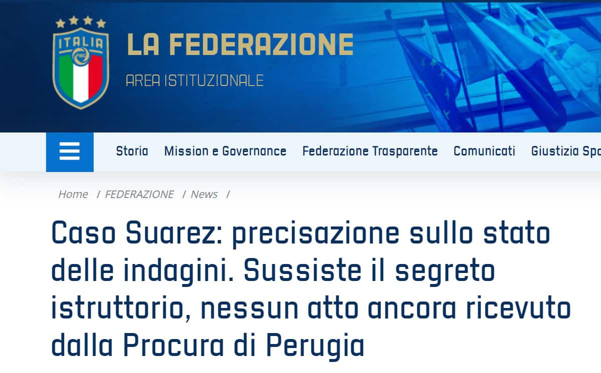 La Figc ha voluto chiarire, con una nota ufficiale pubblicata nel primo pomeriggio di sabato 30 gennaio, la propria posizione in merito all'indagine della Procura di Perugia sull'esame di italiano di Luis Suarez, confermando di avere richiesto gli atti già a settembre: "In relazione alle notizie di stampa in ordine alle iniziative assunte dalla Procura Federale con riferimento all'indagine della Procura della Repubblica di Perugia sul caso Suarez, si precisa che il Procuratore Federale, sin dal settembre scorso, ha formalmente richiesto la trasmissione degli atti al Procuratore della Repubblica di Perugia per le esigenze del procedimento disciplinare sportivo"