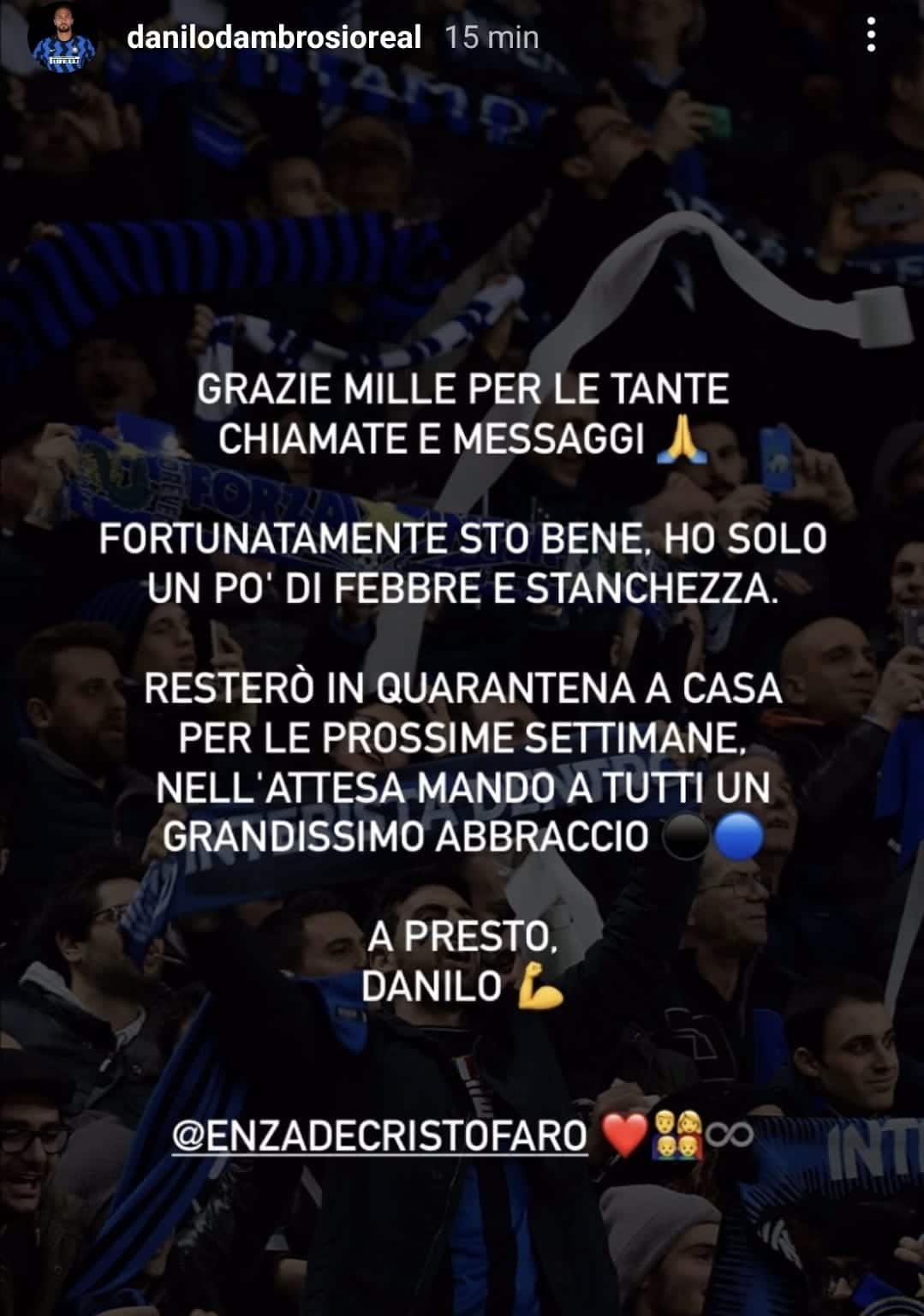 Lo stesso difensore nerazzurro, poco dopo l'ufficialità della sua positività al Covid, ha pubblicato una storia su Instagram con queste parole: "Grazie mille per le tante chiamate e i messaggi. Fortunatamente sto bene, ho solo un po' di febbre e stanchezza. Resterò in quarantena a casa per le prossime settimane. Nell'attesa mando a tutti un grandissimo abbraccio. A presto, Danilo!".