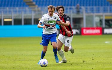 Il gioco della Sampdoria mette così tante volte Damsgaard in questa situazione, a ricevere spalle alla porta il passaggio in verticale del terzino, vicino alla linea laterale e con un uomo addosso, che l’esterno danese sa ormai benissimo cosa deve fare per aggirare la pressione e far continuare l’azione. E cioè, avvicinarsi alla palla per guadagnare un po’ di spazio, senza aspettarla girato di spalle, e voltarsi verso Saelemaekers prima ancora di toccare il pallone per darsi la possibilità di dribblare il belga non appena si fa avanti. Certo, poi non è da tutti riuscire a farlo davvero, dribblare un avversario in uno spazio così stretto, e Damsgaard ci riesce con un movimento di gambe rapidissimo. Con il primo tocco di sinistro allontana il pallone da Saelemaekers, con il secondo di destro se lo porta avanti e salta il belga. È innanzitutto per questa sua incredibile capacità di dribblare in spazi ridotti, e in situazioni scomode, che Damsgaard è diventato presto così prezioso per la Sampdoria, ma va detto può ancora migliorare molto nelle scelte e nella precisione delle giocate subito dopo il dribbling. In questo caso sbaglia il cambio di gioco verso Candreva, una giocata che, se eseguita con più precisione, avrebbe permesso alla Samp di arrivare in modo pericoloso nella metà campo del Milan.