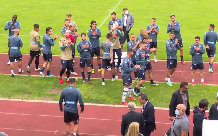 Un lungo applauso verso i 300 tifosi presenti in tribuna, la mano tesa della squadra verso il pubblico azzurro. È iniziato così il ritiro del Napoli a Dimaro, il "battesimo" dell'era targata Luciano Spalletti. Un gesto - l'applauso - annunciato qualche giorno fa dall'allenatore, il simbolo dell'inizio di una nuova pagina per gli azzurri che in Trentino hanno effettuato il primo allenamento. Un'ora e venti minuti, il primo passo per dare forma al nuovo Napoli sotto gli occhi del presidente De Laurentiis e del direttore sportivo Giuntoli, reduci da un incontro a Roma per perfezionare le strategie del mercato in uscita.