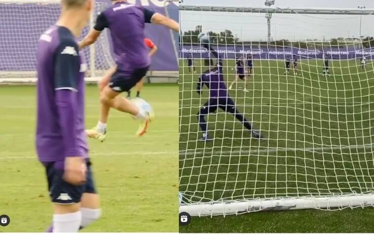 Fiorentina, Vlahovic segna un gol pazzesco di tacco in allenamento. VIDEO
