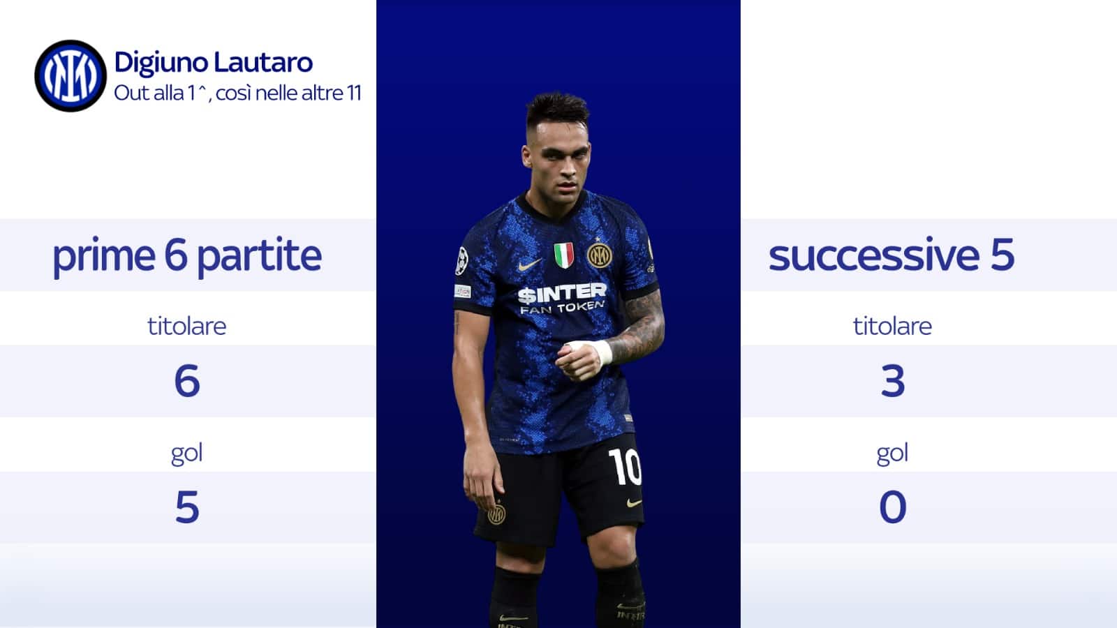 Il presente, invece, è segnato da un digiuno che dura dal 2 ottobre quando siglò il gol vittoria contro il Sassuolo. Dopo aver messo a segno cinque reti nelle prime sei presenze stagionali in Serie A, Lautaro è rimasto a secco nelle ultime cinque uscite contro Lazio, Juventus, Empoli, Udinese e Milan. Solo in tre occasioni, però, era sceso in campo dall'inizio, complice gli impegni delle nazionali.
