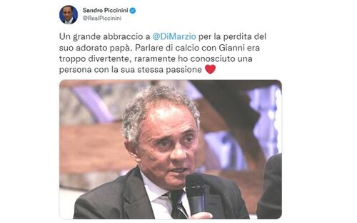 SANDRO PICCININI. "Un grande abbraccio a Gianluca Di Marzio per la perdita del suo adorato papà. Parlare di calcio con Gianni era troppo divertente, raramente ho conosciuto una persona con la sua stessa passione".