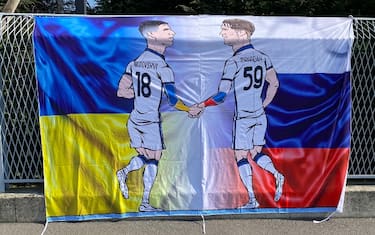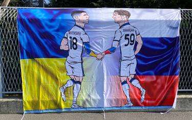Alla vigilia della sfida di Europa League tra Atalanta e Bayer Leverkusen, all'esterno del centro sportivo di Zingonia è stato appeso uno striscione contro la guerra. Nell'immagine si vede l'ucraino Malinovskyi che stringe la mano al russo Miranchuk (suo compagno di squadra). La vignetta è opera di Gokcen Eke, detto "Caricaturella", autore di tante caricature ispirate al mondo del calcio