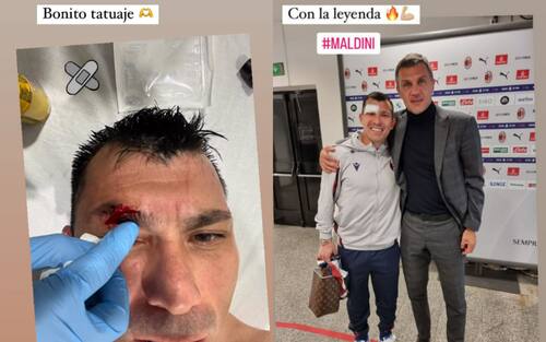 Il Bologna se ne è andato da San Siro con un punto, il 'pitbull' Medel con qualcuno di più. Eccolo sui suoi social postare prima una foto del medico del Bologna che gli sutura la ferita negli spogliatoi e poi la foto ricordo con Maldini a fine gara